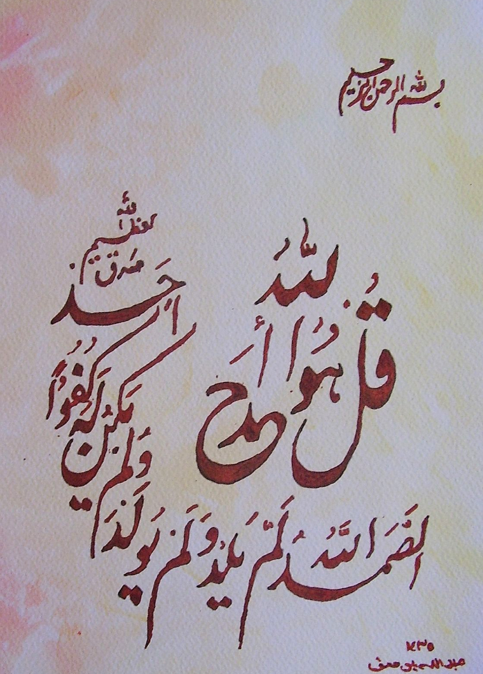 It was already a more sophisticated, clearer version of sikaste writing. It is characterized by its letters tilting strongly from right to left in the direction of writing, and the lines slide from top to bottom. It was not widely used to copy the Qur’an, but primarily to make documents in Persian.Here is an example of it, Al-Ikhlas surah in Taalik writing: